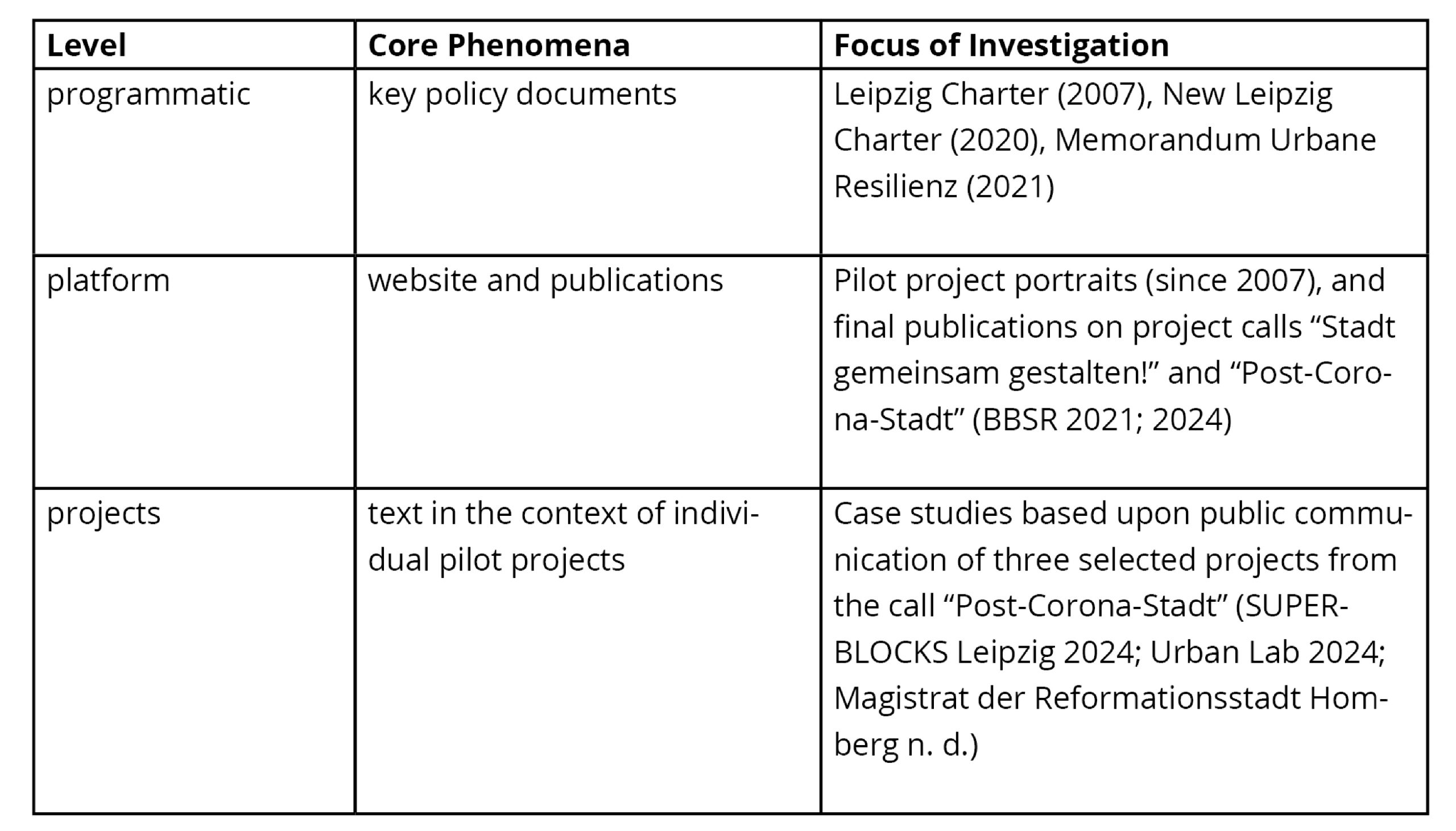 We analyze narrative futures and how they shift across (1) the overarching programmatic level of core policy ideas that act as an orientation for the NSP as agreed upon at the national and European level, (2) the NSP platform, where urban development is discussed with the policy community and (3) the experimental projects funded and supported by the NSP. Within a text-analytical approach, we concentrate on textual data aligned along the main analytical axes of resilience as a topic and translations between the three levels (Table 1). We acknowledge that the NSP platform features a diversity of sites (such as discussions at the annual main conferences). However, for the sake of comparability, we narrow our focus to the textual representations of project calls and website portraits. Thus, we analyze how policy objectives have been translated to frame projects and how lessons from individual projects have been incorporated back into platform-level framing.