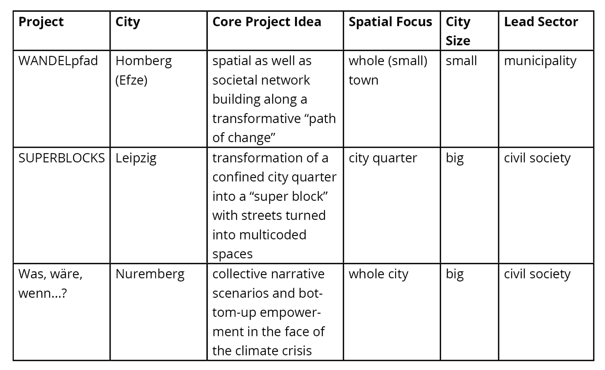 To investigate how urban resilience is narrated on the level of individual projects, we selected three sample projects from the Post-Corona-Stadt call. Our main focus was to achieve diversity in the core project focus (i. e. how to operationalize resilience on a local level). However, we also took into account the criteria of lead actors as well as city size (see Table 4). Looking at published texts only, we observe significant differences in the narratives told in the project’s contexts.
